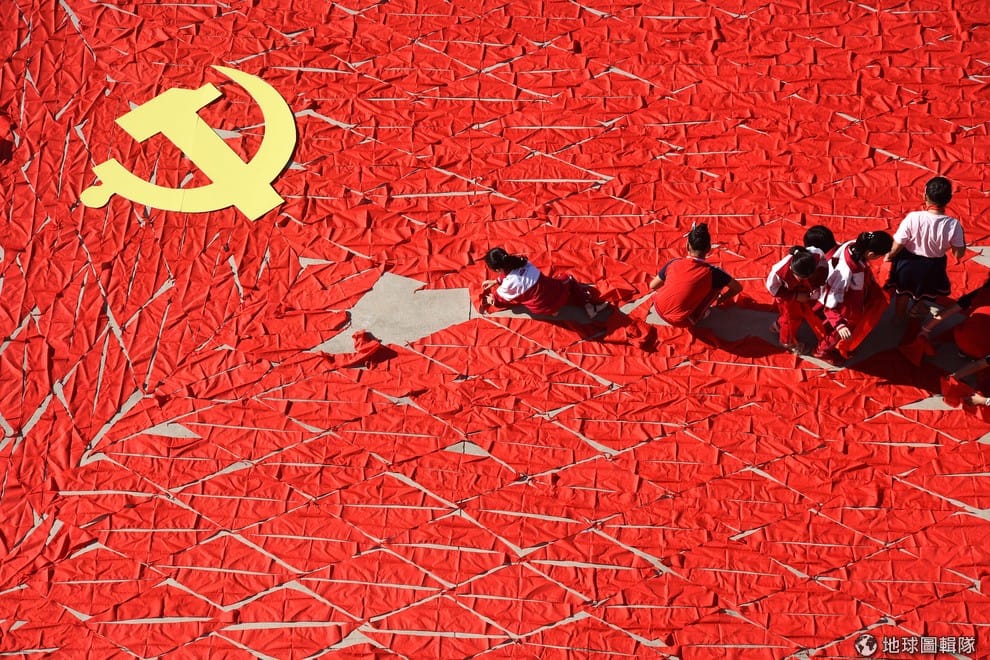 學生們將脖子上的紅領巾解上,鋪在地上拼成中國共產黨的黨旗,下個月 18日即將在北京召開中國共產黨第十九次全國代表大會。