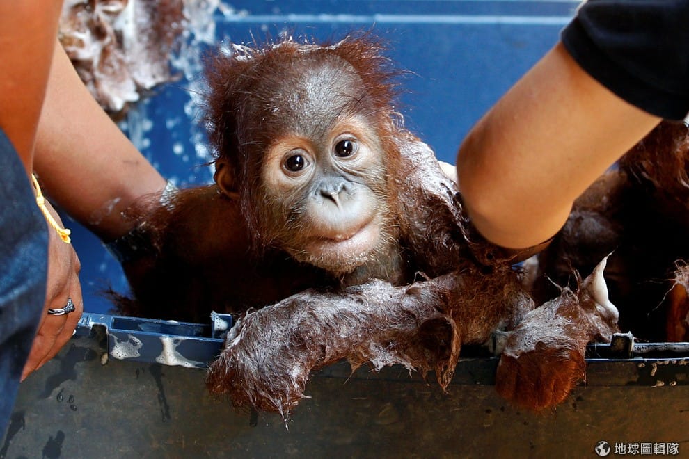 在泰國中部叻丕府的野生動物中心,工作人員正在幫剛剛送來的紅毛猩猩寶寶洗澡。