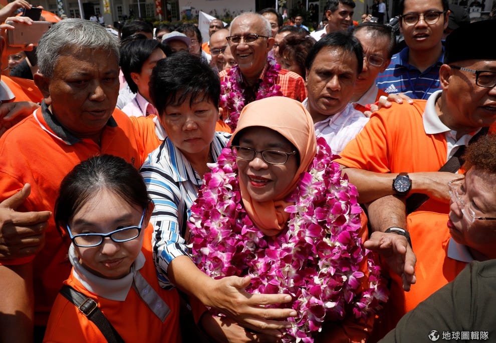 新加坡新總統哈莉瑪脖子上掛滿花圈,開心地和支持民眾打招呼。哈莉瑪的父親是印度裔,這點也引起民眾對她血統的質疑。