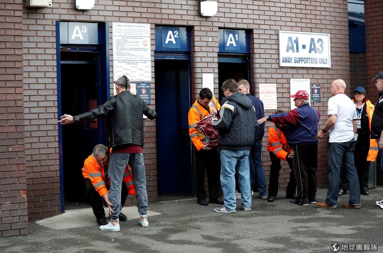 在英國西米德蘭茲郡的山楂球場(The Hawthorns),準備觀看比賽的人們正在接受指示進行安檢。