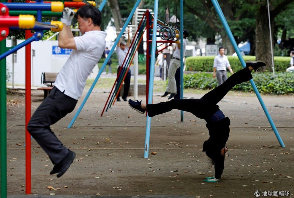 在公司的午休時間,數名上班族特地跑到公園裡舒展久坐不動的身子。