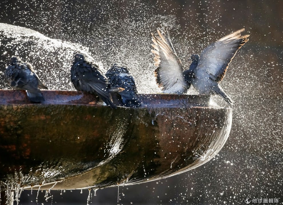 在烏克蘭首都基輔(Kiev),數隻鴿子在噴水池旁洗淨身軀,用翅膀濺起了無數水花。