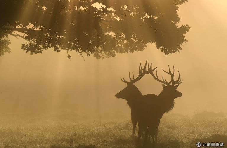 在倫敦里奇蒙公園(Richmond Park)內,兩頭進入發情期公鹿穿梭在薄霧籠罩的草地上。