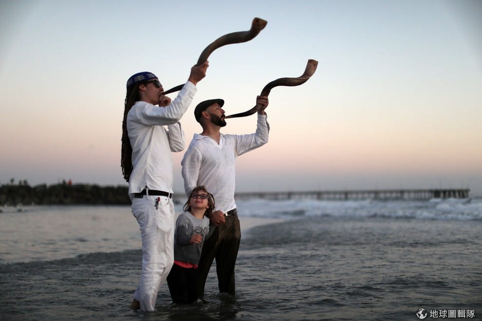 在洛杉磯,極端正統派的猶太人站在海邊舉行吹角儀式(Tashlich),象徵吹走他們過去犯下的錯誤,以此迎接猶太新年的到來。