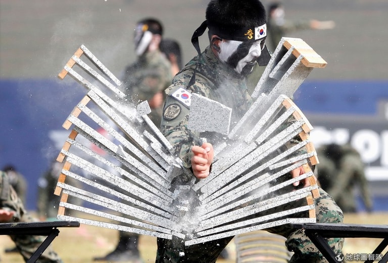 為了迎接第 69屆南韓武裝部隊日,特種部隊的成員開始加緊訓練跆拳道技巧,其中,劈磚就是展現平時武術訓練的好活動。