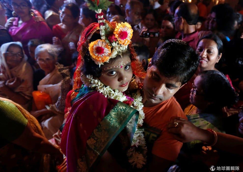 今年 5歲的穆克吉被選為新一代的庫瑪麗(Kumari)女神,她由父親抱著參加宗教活動。