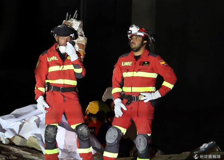 來自西班牙的救難人員看著斷垣殘壁稍作休息,目前受到強震重創的墨西哥市救援行動仍在進行中。