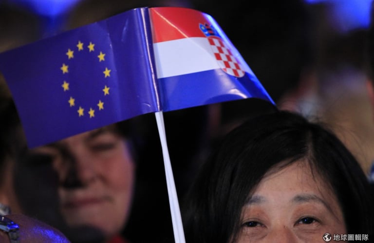 照片中是宣布克羅埃西亞被宣布正式成為歐盟成員國的當晚,民眾手拿克國國旗以及歐盟旗幟