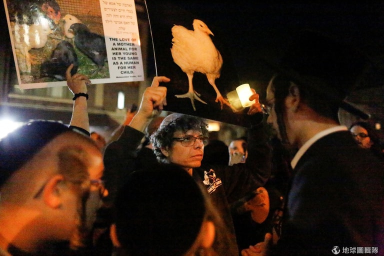 在紐約,動保人士高舉抗議告示牌,反對猶太正教的贖罪儀式。在儀式上,猶太人會殺雞象徵贖罪,隨後將雞捐給慈善團體食用。根據現代規範,男性在贖罪儀式上要殺公雞,女性則是殺母雞。