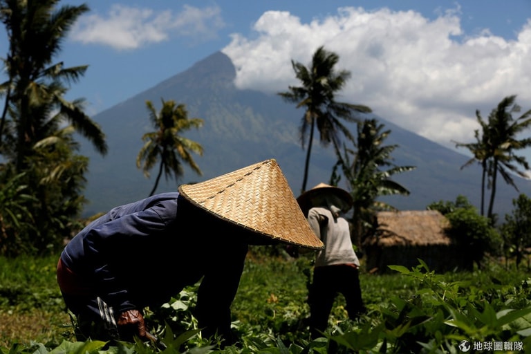 在度假勝地峇里島,農人的身後是隨時有可能爆發的阿貢火山(Mount Agung)。