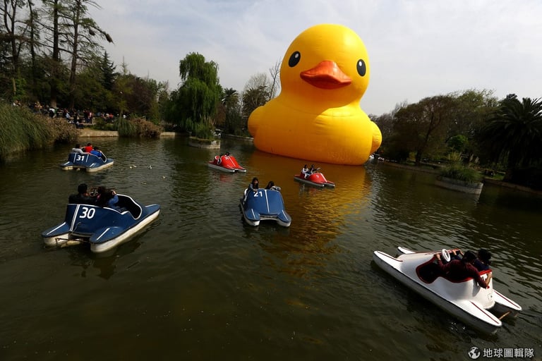 在智利首都聖地亞哥,人們開心地在公園內踩著遊船,和荷蘭藝術家霍夫曼(Florentijn Hofman)的作品黃色小鴨一起享受悠閒時光。