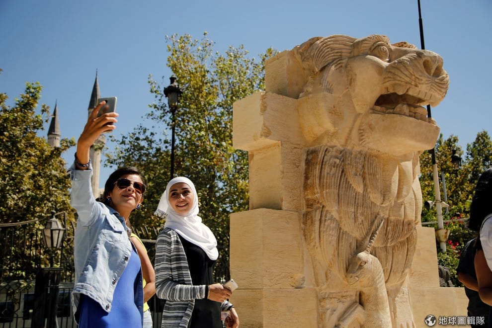 民眾開心地和阿勒特神獅(Lion of Al-lāt)雕像自拍,這尊由石灰岩打造而成有 2,000年歷史的雕像,在 2015年被恐怖組織伊斯蘭國(IS)破壞,直到近日才修復完成。