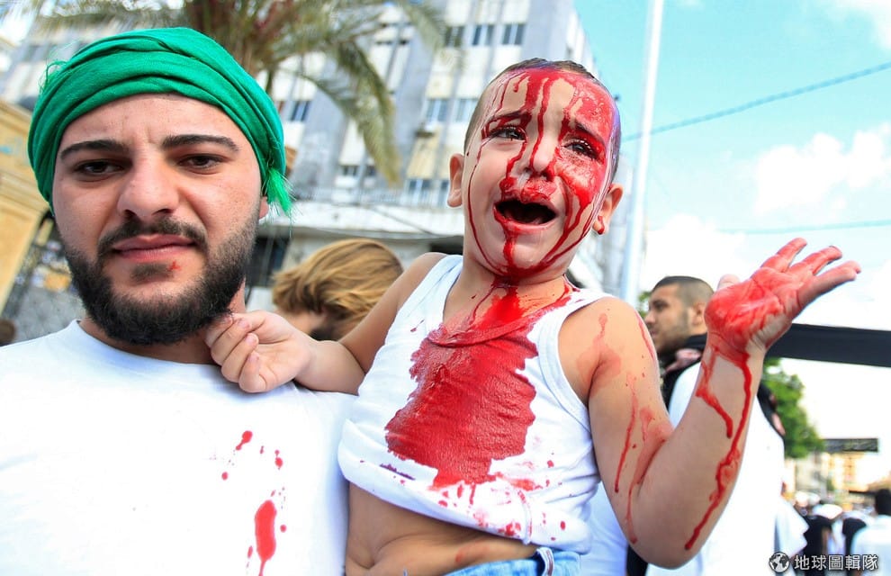 在什葉派穆斯林的傳統節日阿舒拉節(Ashura)上,一名父親抱著血流滿面的孩子,他的兒子剛剛被剃刀削前額導致血流不止,這個儀式是為了紀念先知穆罕默德(Mohammad)的孫子阿里(Hussein ibn Ali)之死。
