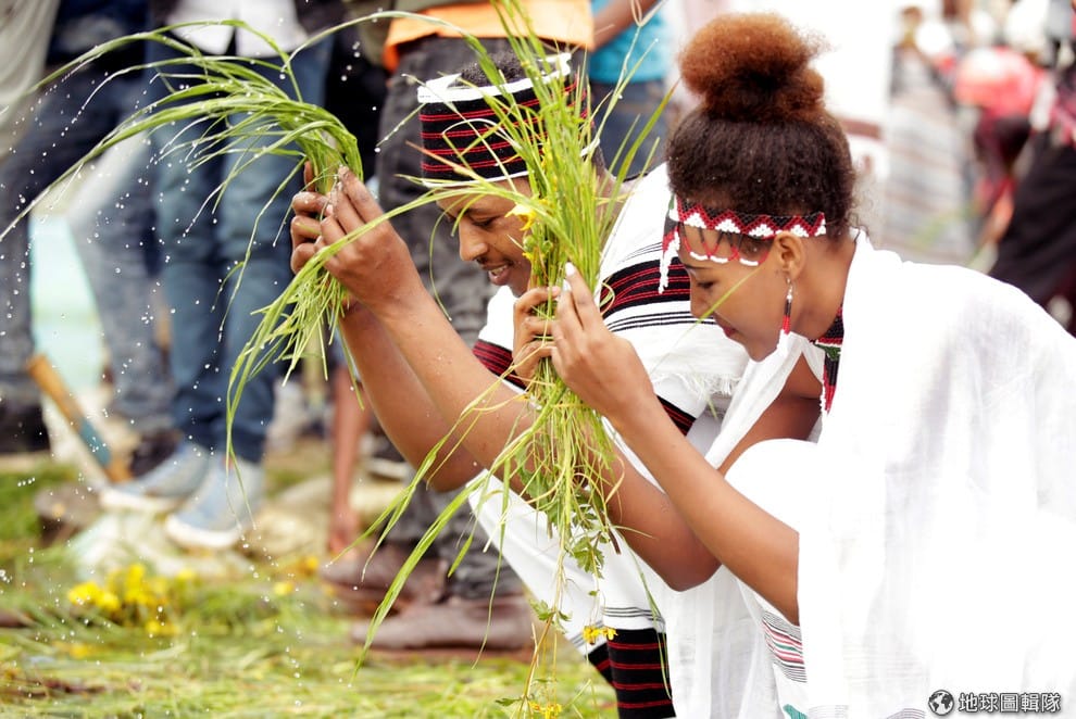一對奧羅莫族(Oromo)情侶穿上傳統服飾,將農作物上的水珠灑向自己,藉此慶祝奧羅莫族的感恩豐收節。