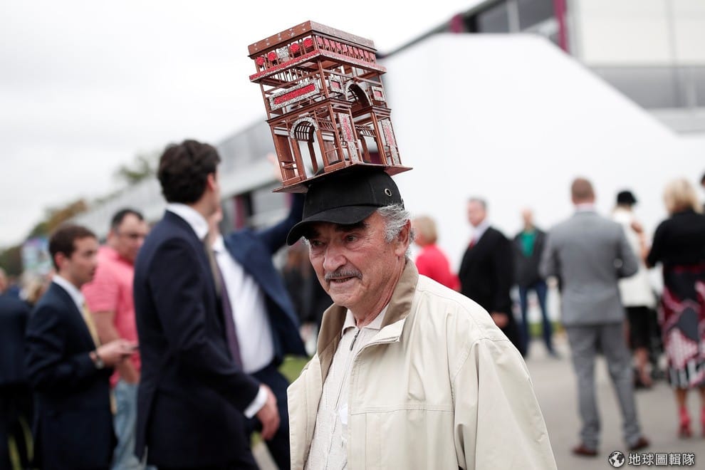 在尚蒂利(Chantilly)賽馬場上,一名男子頂著凱旋門造型的頭飾在鏡頭前留影。