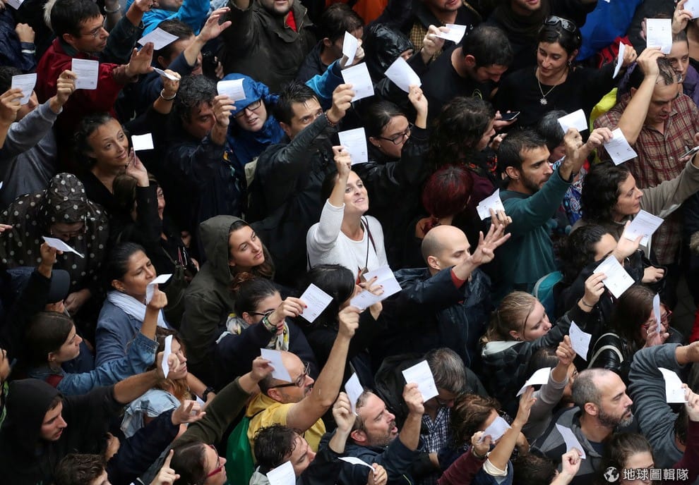 在巴塞隆納,民眾手拿公投選票站在投票所外,表達加泰隆尼亞自治區想獨立的決心。