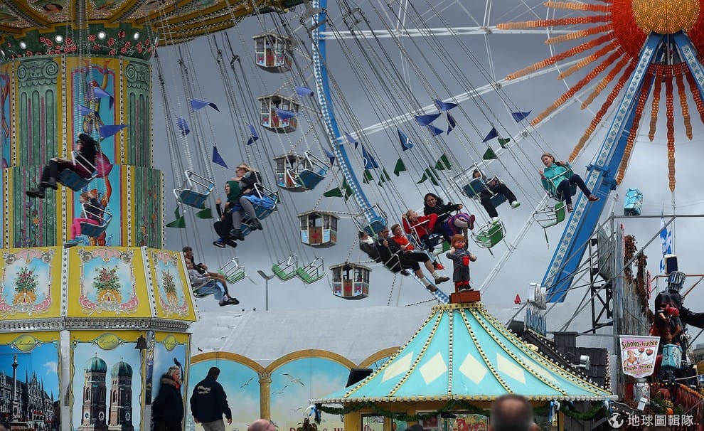 在第 184屆慕尼黑啤酒節的場邊,民眾開心地乘坐遊樂設施。