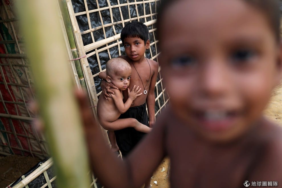 在孟加拉緊鄰緬甸的科克斯巴扎爾縣(Cox's Bazar)的難民營,洛興雅難民小孩看向鏡頭,他們剛剛逃離緬甸軍的鎮壓。
