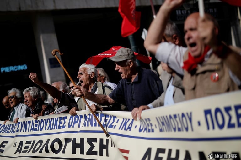 在雅典街頭,憤怒的退休人員拿著拐杖和抗議海報現身,他們不滿希臘政府刪減退休金的計畫,害怕自己原有的福利受影響。