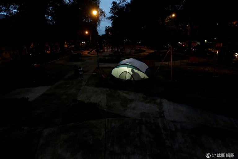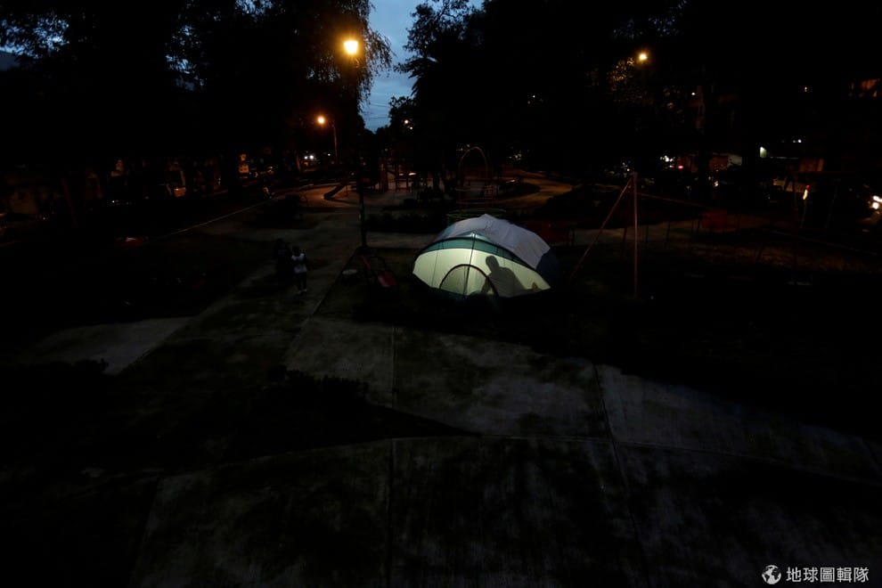 一頂亮著微光的帳篷是戈麥茲(Miguel Gomez)和家人棲身的地方,他們的家園在上個月的強震中成了一片廢墟,不知道哪一天才能重建完成。