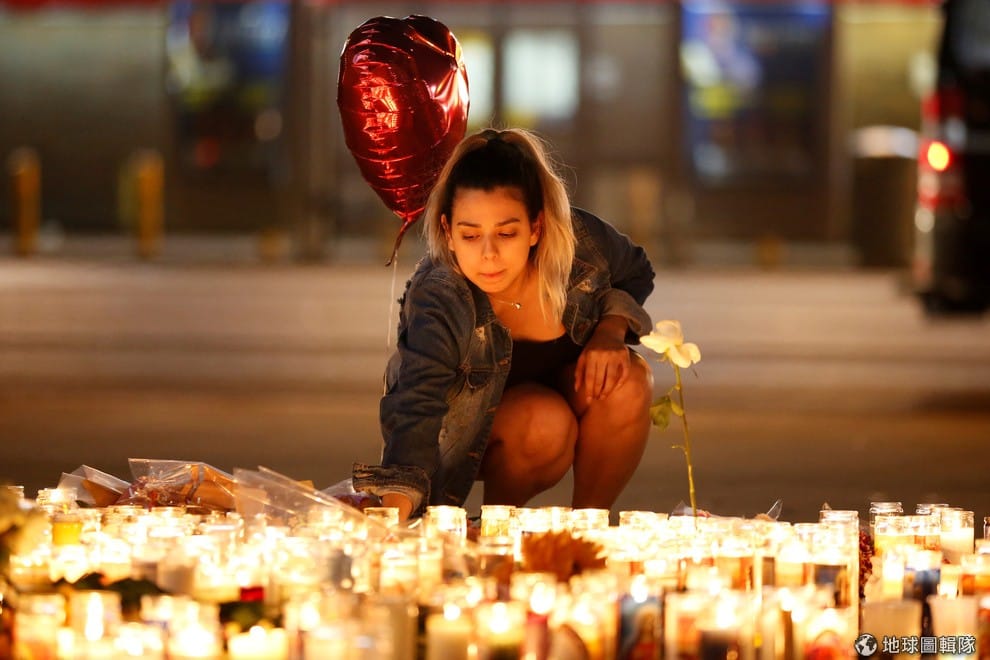 一名女子點燃擺在地上的蠟燭,悼念 1號在賭城演唱會槍案中喪命的罹難者。