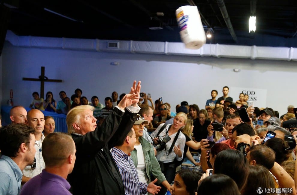 3號這天,美國總統川普來到受瑪麗亞(Maria)颶風重創的波多黎各勘災,他在首都聖胡安(San Juan)的教堂發送救援物資。