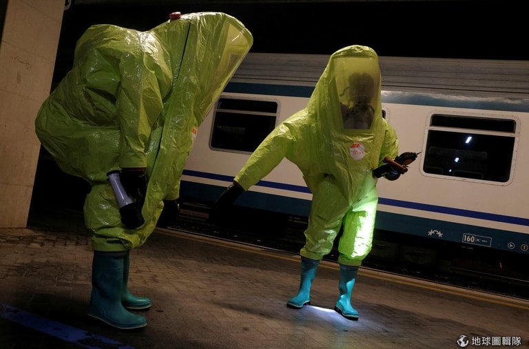 在威尼斯人來人往的聖塔露琪亞(Santa Lucia)火車站,消防員全副武裝參加反恐演習。