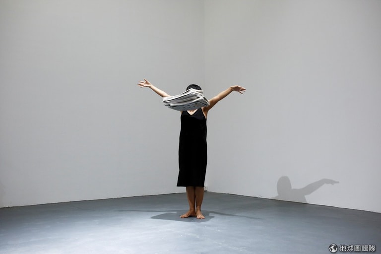 在北京外圍的宋莊藝術區,中國表演藝術家懿菲將一疊報紙往下丟,象徵她不要新聞,這是第 18屆OPEN國際行為藝術節的節目之一。