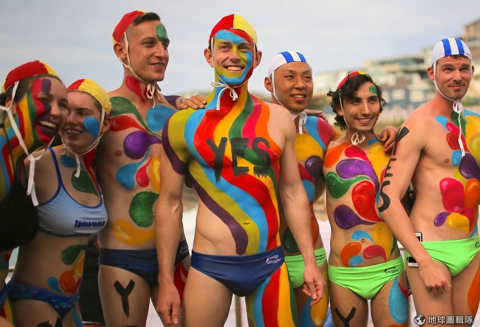 在雪梨的塔瑪拉瑪海灘(Tamarama Beach),數名支持同性婚姻的民眾在身上彩繪出「Yes」和彩虹的花色,希望澳洲可以成為全球第 25個通過同性婚姻的國家。