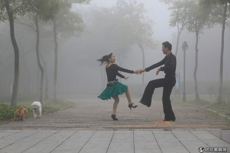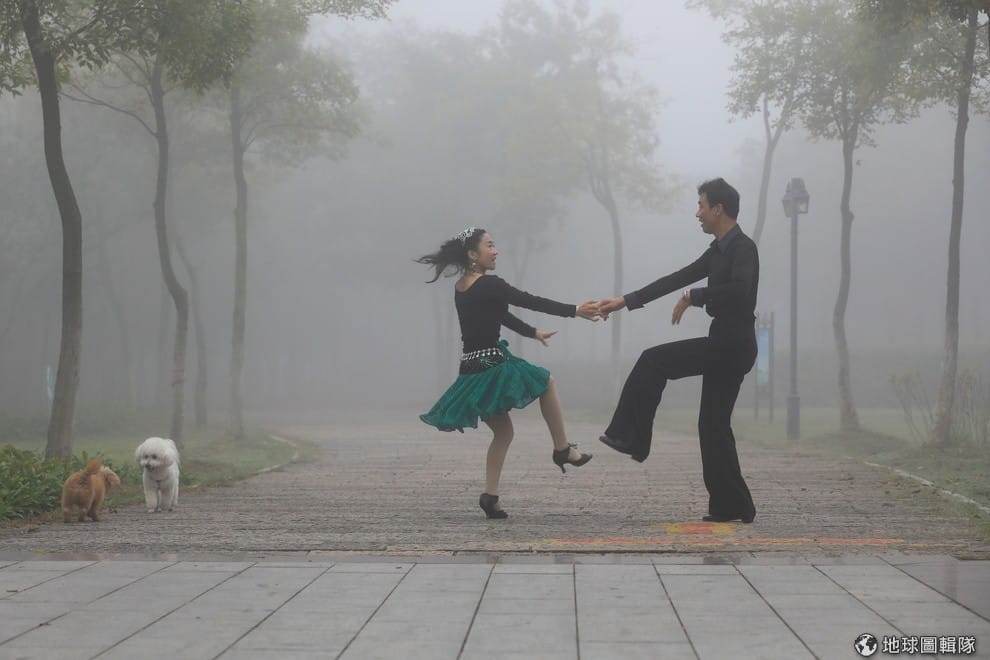 在江蘇省淮安市,一對舞者在濃霧中翩翩起舞。