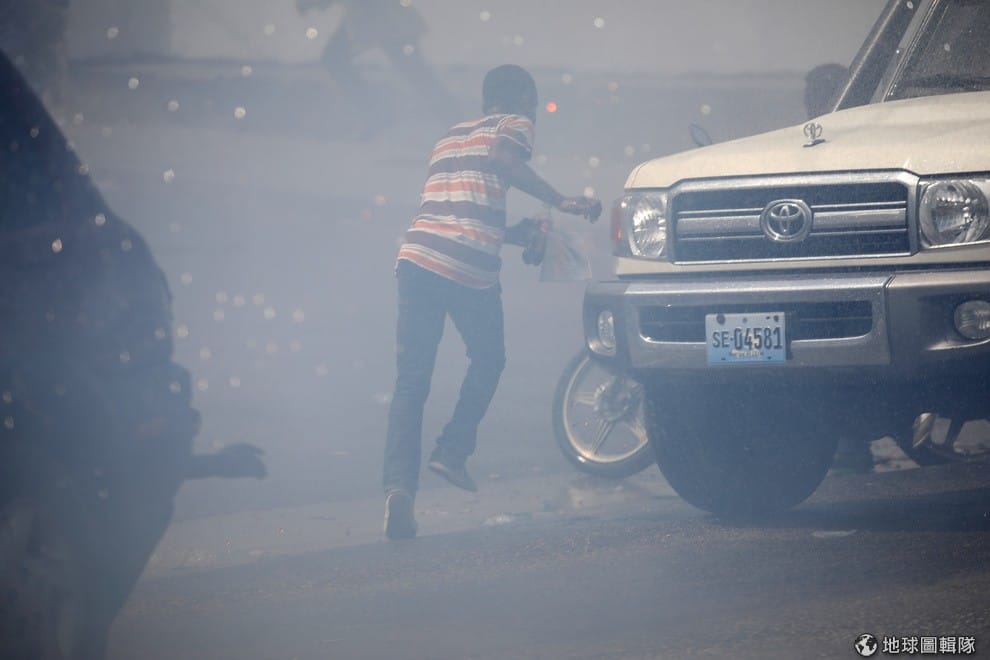 在海地首都太子港(Port-au-Prince),示威者倉皇逃離用來驅散群眾的催淚瓦斯和高壓水炮。
