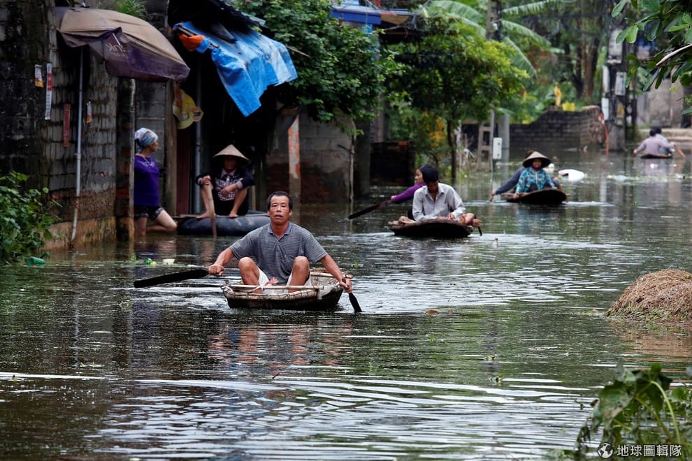 越南首都河內因為遭逢大雨,導致部分村落出現淹水的情況,居民也只能用小船充當交通工具。