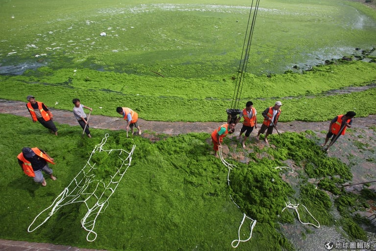 近年來,每到6月底、7月初時,中國山東青島的南部沿岸就會有大量的綠色滸苔入侵沙灘,加上風勢與海波的助長,滸苔不停朝沙灘湧進,清也清不完,這是因為該海域海上活動和近海養殖業發達,造成海水優氧化嚴重,才致使滸苔湧現的情況一年比一年嚴重。