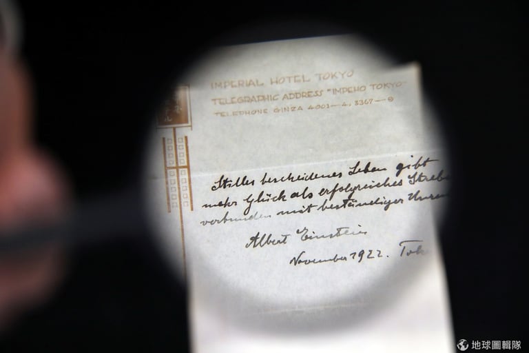 服務生仔細端詳了紙條,上面以愛因斯坦的母語德語寫下:「一個平靜謙和的人生,比為了追求成功汲汲營營還能帶來更多快樂」。
