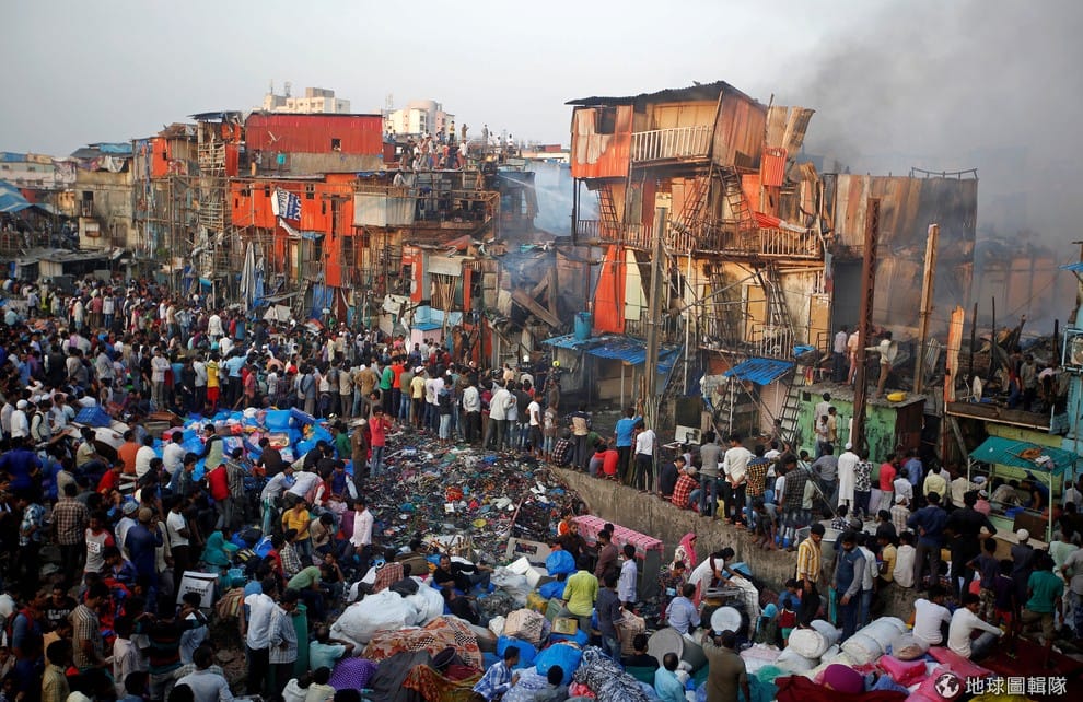 孟買(Mumbai)的難民營發生大火,住在鄰近地區人們紛紛聚集在現場,觀看著試圖滅火進入現場的消防人員。