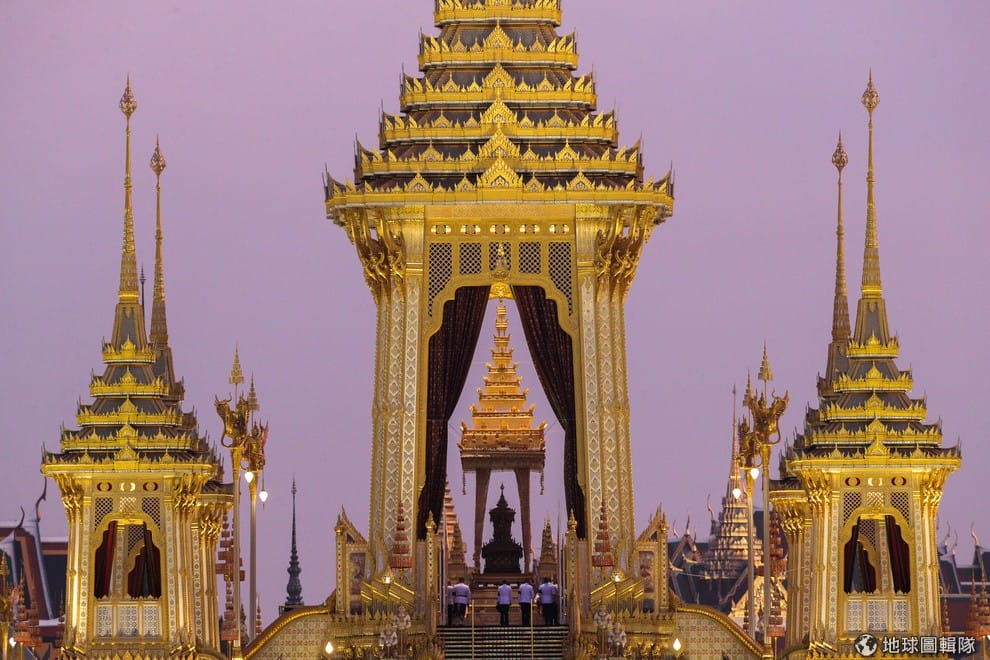 畫面中為安置泰皇蒲美蓬(Bhumibol Adulyadej)大體的皇家靈柩(Royal Urn),泰皇蒲美蓬逝世一年後,泰國在這幾天為他正式舉行國葬。