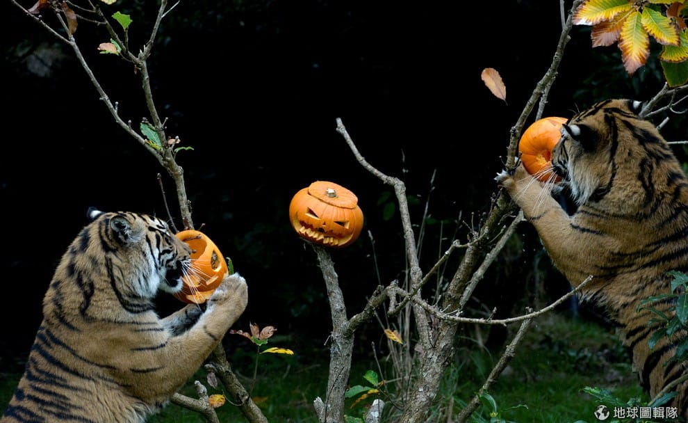 在倫敦動物園內,兩隻蘇門答臘虎正在大啖園方為了慶祝萬聖節所設置的造型南瓜。