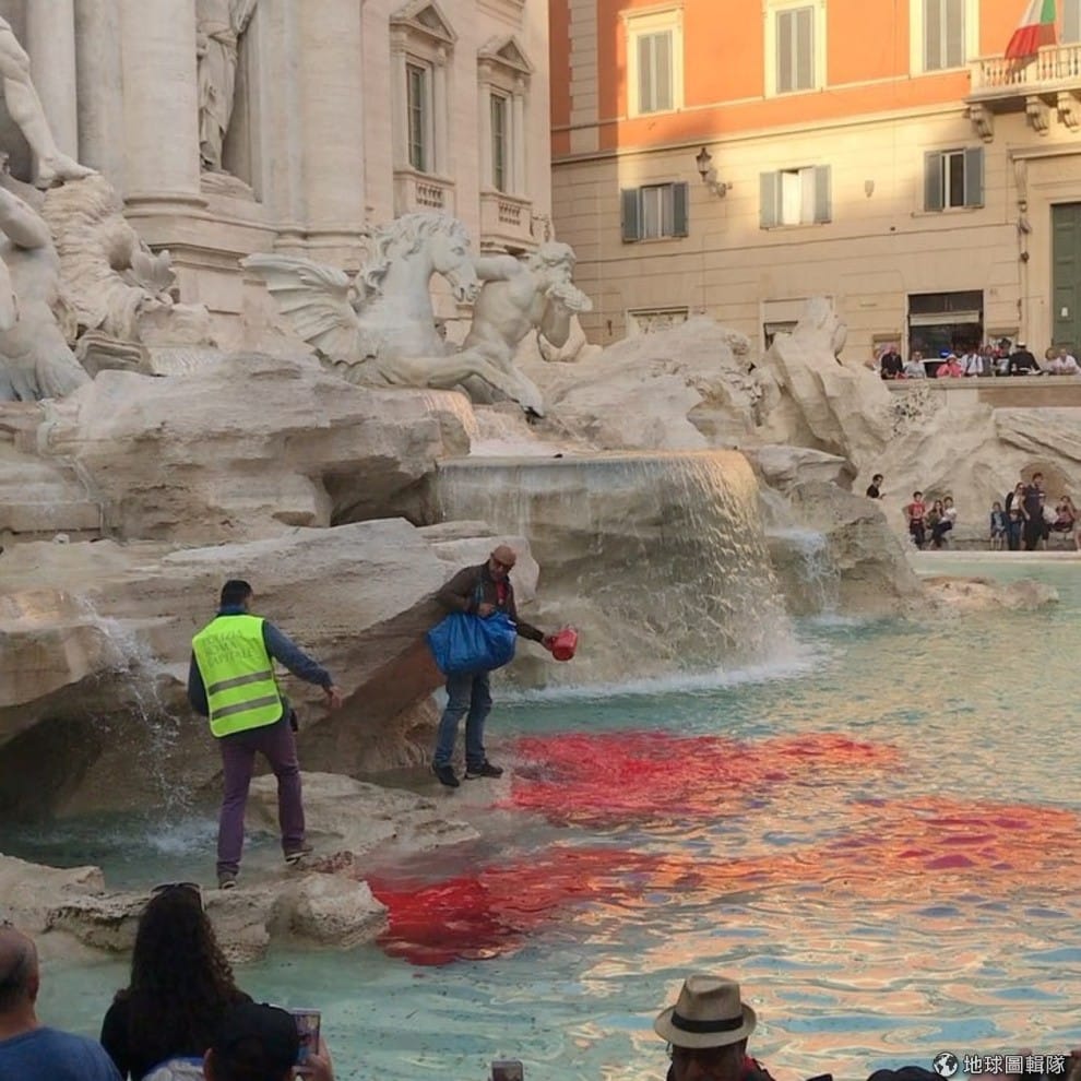在一支從社群網站的影片截圖中,捕捉到了一名試圖把羅馬特雷維噴泉(Trevi Fountain)染紅的男子。