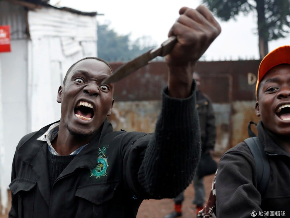 畫面另一端,同樣是位於肯亞首都奈洛比(Nairobi)的貧民窟,一名反對黨支持者對著警察亮出小刀,表達他們示威受到阻撓的不滿。