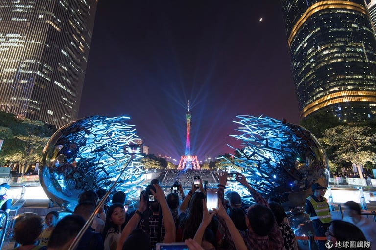 民眾齊聚在打著璀璨燈光的廣州電視塔前,用手機捕捉燈光藝術家的巧思。