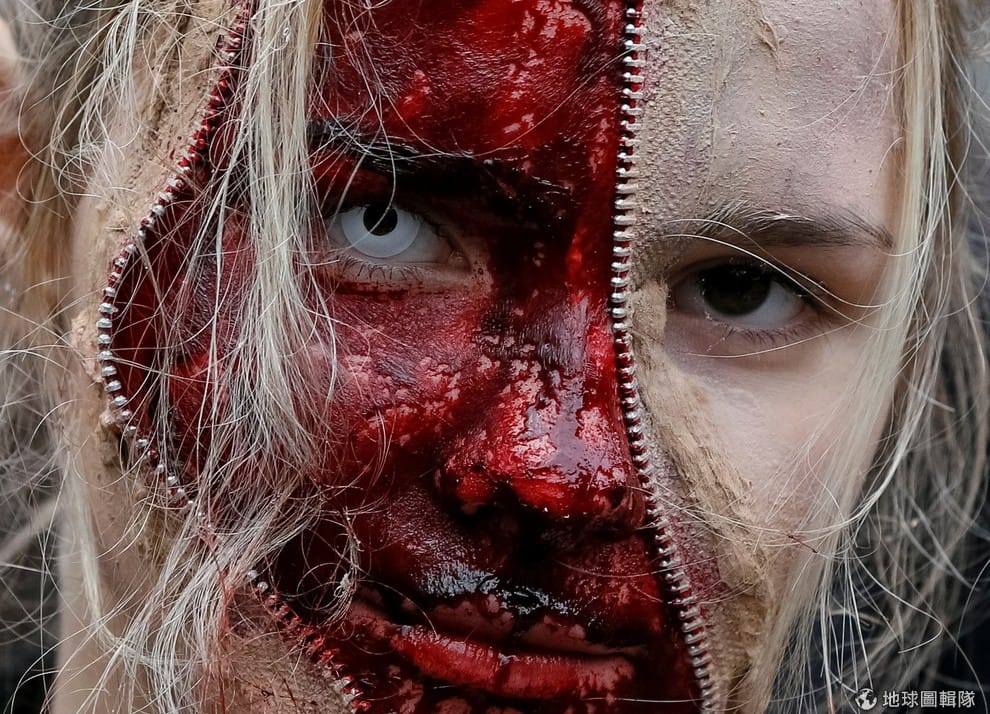 一名女子向鏡頭展示自己精心繪製的殭屍裝,這樣的妝容也讓她成為基輔大遊行的焦點。