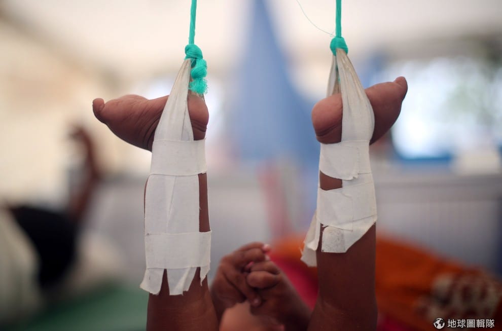 今年一歲的洛興雅難民烏拉(Shahid Ullah)兩隻小腳被倒吊起來治療,他的奶奶在抱著他逃離緬甸軍迫害時不小心將他摔落,幸好祖孫倆最後成功跨越邊境,抵達位於科克斯巴扎爾縣(Cox's Bazar)的難民營。