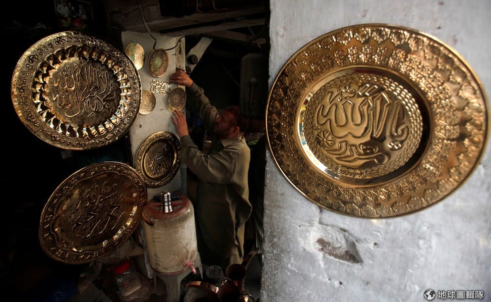 在西北部的白沙瓦市(Peshawar),一名工匠小心翼翼地將自己親手製作的黃銅盤掛起來。