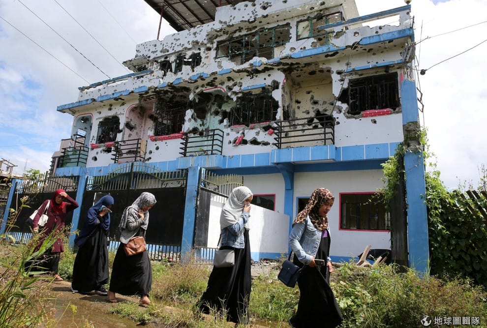 在民答那峨島(Mindanao)的馬拉韋市(Marawi City),從疏散中心返家的婦女走過彈痕累累的建築,這棟建築據說被租給了親伊斯蘭國(IS)的武裝組織「馬巫德」(Maute)。在馬拉韋市部分區域被該武裝組織佔據近 5個月後,該城市已經從武裝組織手上成功收復。