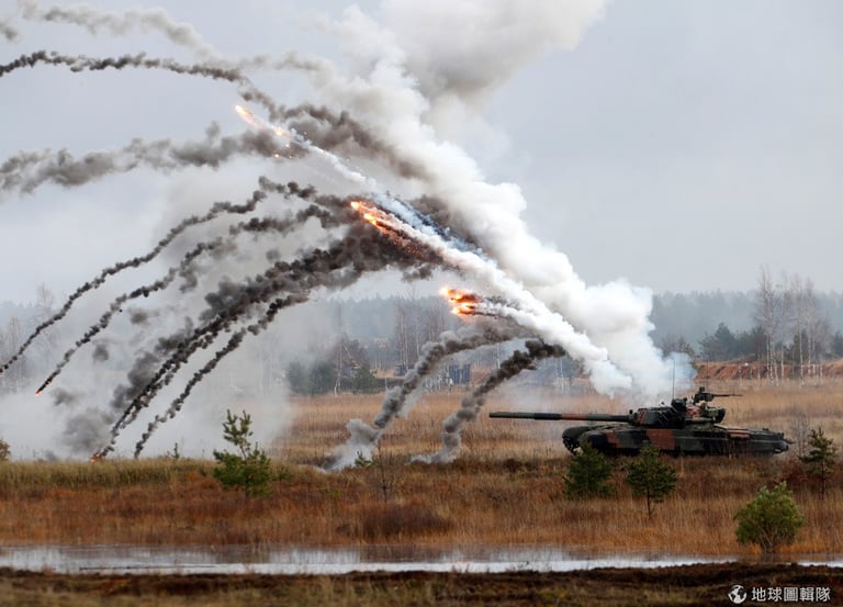 一輛波蘭坦克在戰火中前進,時值 2017銀箭演習(Silver Arrow 2017),波蘭和另外 10個北大西洋公約組織(NATO)成員國一塊在拉脫維亞進行軍事演習,測試國家的軍事實力。