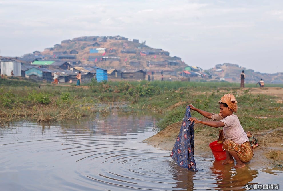 在科克斯巴扎爾縣(Cox's Bazar)的難民營,一名逃離緬甸軍迫害的洛興雅難民在河邊洗衣。