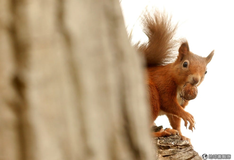 一隻松鼠叼著胡桃從樹後探出身來,可愛的模樣全讓鏡頭捕捉了下來。