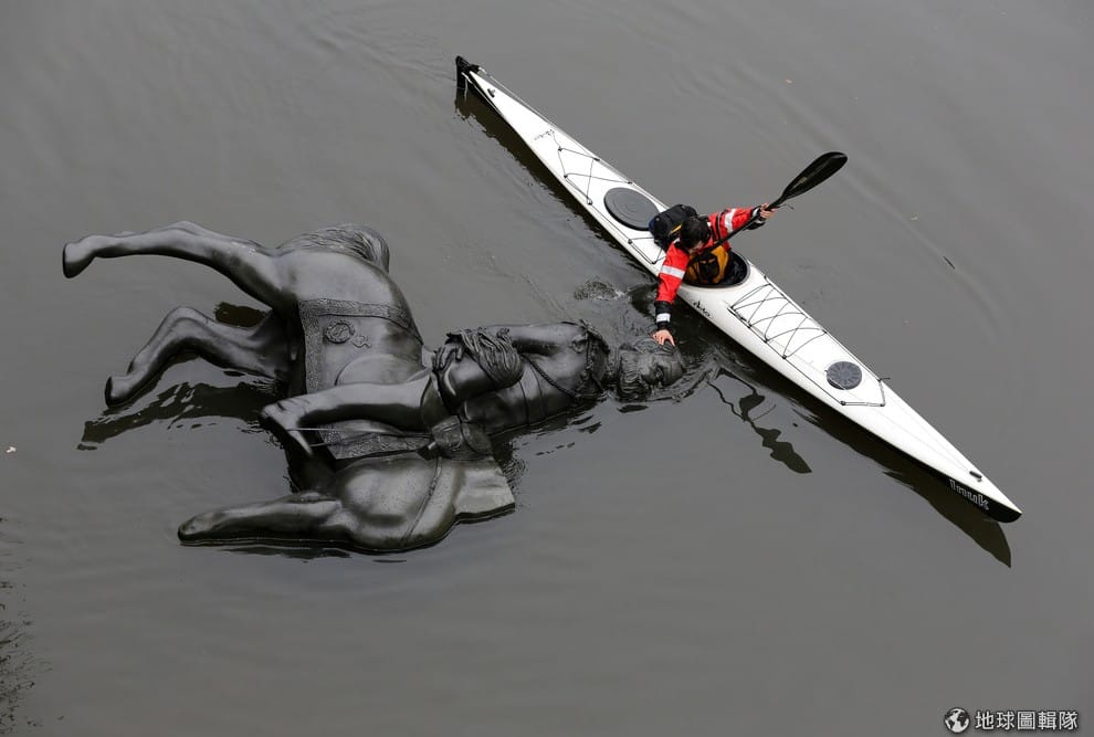 加拿大藝術家麥考利(Jon McCurley)划著獨木舟,將英國國王愛德華七世(Edward VII)的複製雕像順著水流往下推,作為藝術創作的一環。