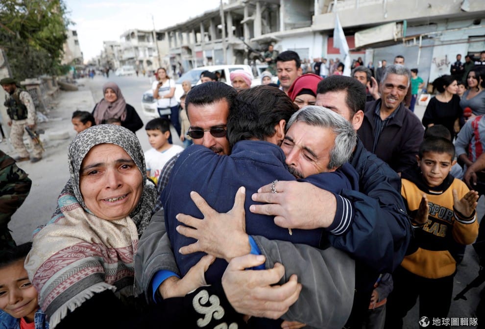 在敘利亞西部的霍姆斯市(Homs),親友們看到被恐怖組織伊斯蘭國(IS)挾持的人質返家,一擁而上給他一個大大的擁抱。