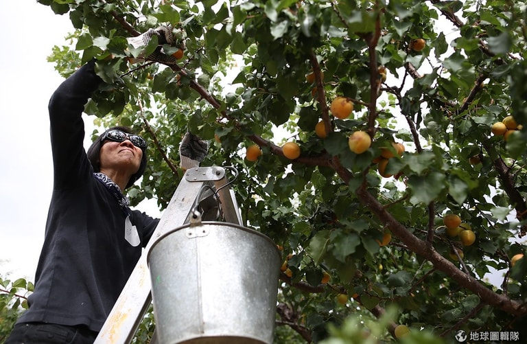 剛採摘下來的杏桃和洋李,要經由志工分類再包裝起來。